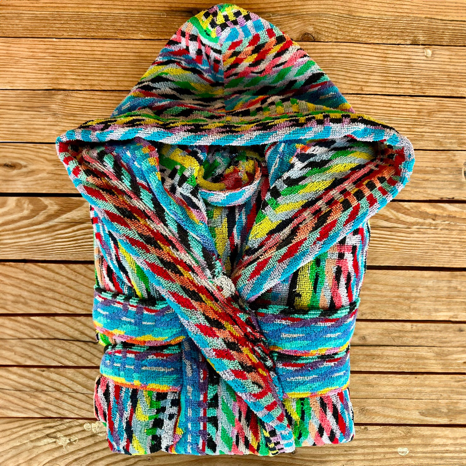 Accappatoio con cappuccio, tasche e comoda cinta.