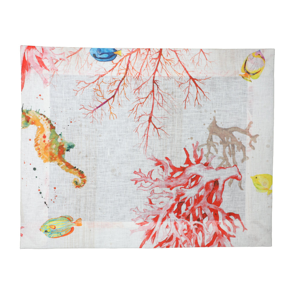 Sottopiatto Pregiato dell'innovativa collezione Palau in Puro Lino Stampato, disponibile nella misura 50x40 cm. Collezione creata con molta originalità in onore del mare, della sua grandezza e delle sue infinite bellezze. Il Sottopiatto Palau è in un'allegra tinta di Rosso, come gli splendidi coralli marini, ciò non toglie che ci sono altri colori che sorprendono ed abbelliscono il disegno come ad esempio il giallo ed il blu dei fantastici pesciolini esotici! Insomma un disegno dedicato agli elementi del mare, unico nel suo genere. E' il risultato di un'elaborata lavorazione sartoriale fatta solo in Italia, precisamente a Montefalco, dal ricercato brand Tessuto Artistico Umbro. Il Sottopiatto Palau è davvero un gioiello che impreziosisce la vostra casa con un articolo affascinante e di primissima qualità!