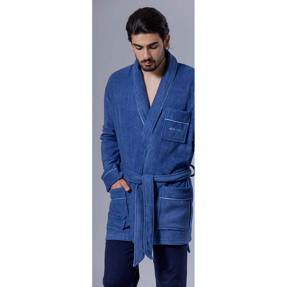 Elegante giacca da camera per uomo a tinta unita in morbido pile del brand Pierre Cardin modello Baldo colore Avion, con taschino sul petto e tasche impreziosite da una codina di topo e raffinato collo a scialle. La giacca contiene anche una comoda cinta. La giacca da camera rappresenta il prodotto ideale per stare comodi e caldi in casa per gli uomini che amano vestire con stile e classe anche in casa.