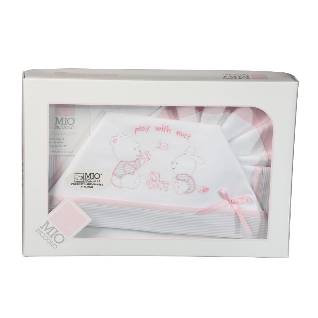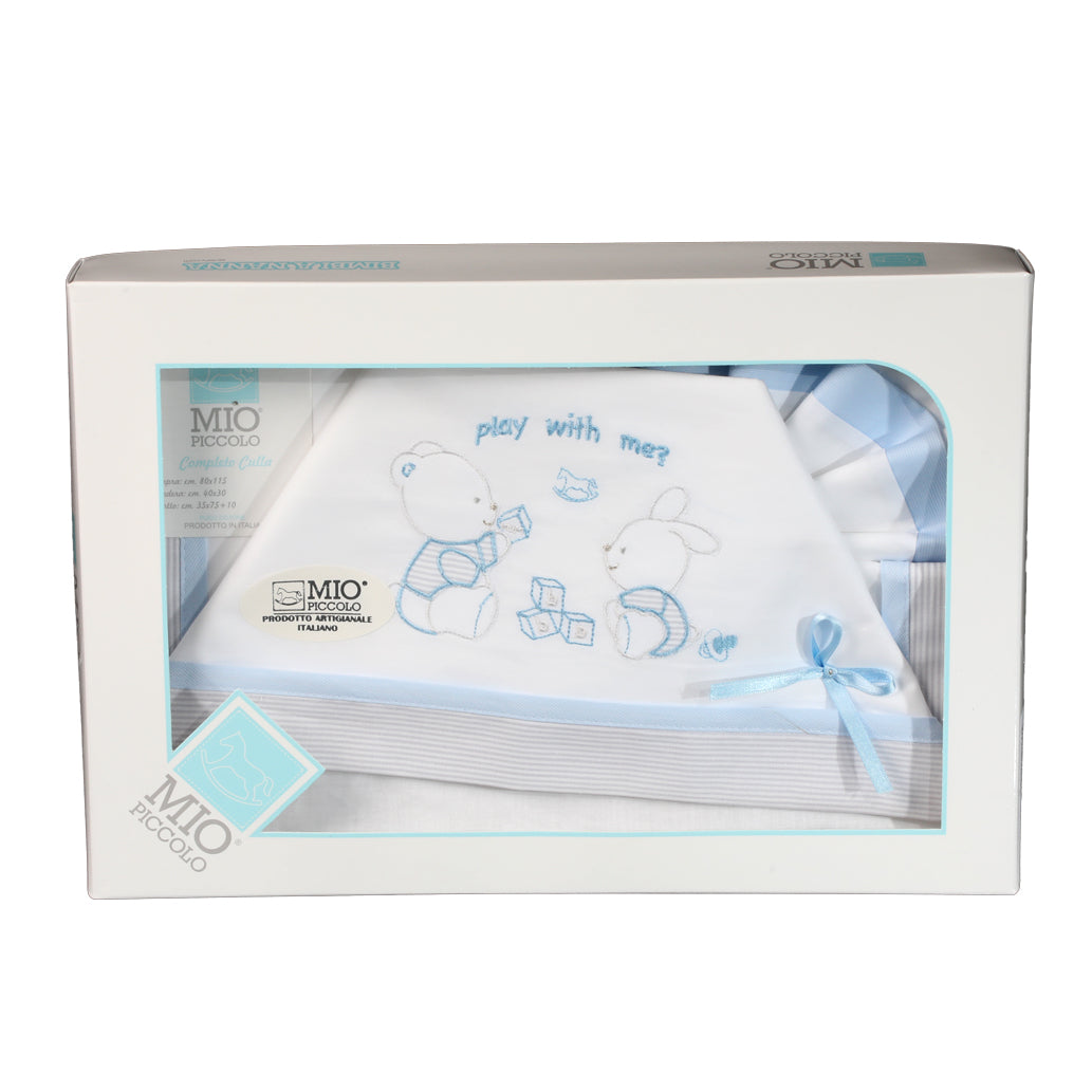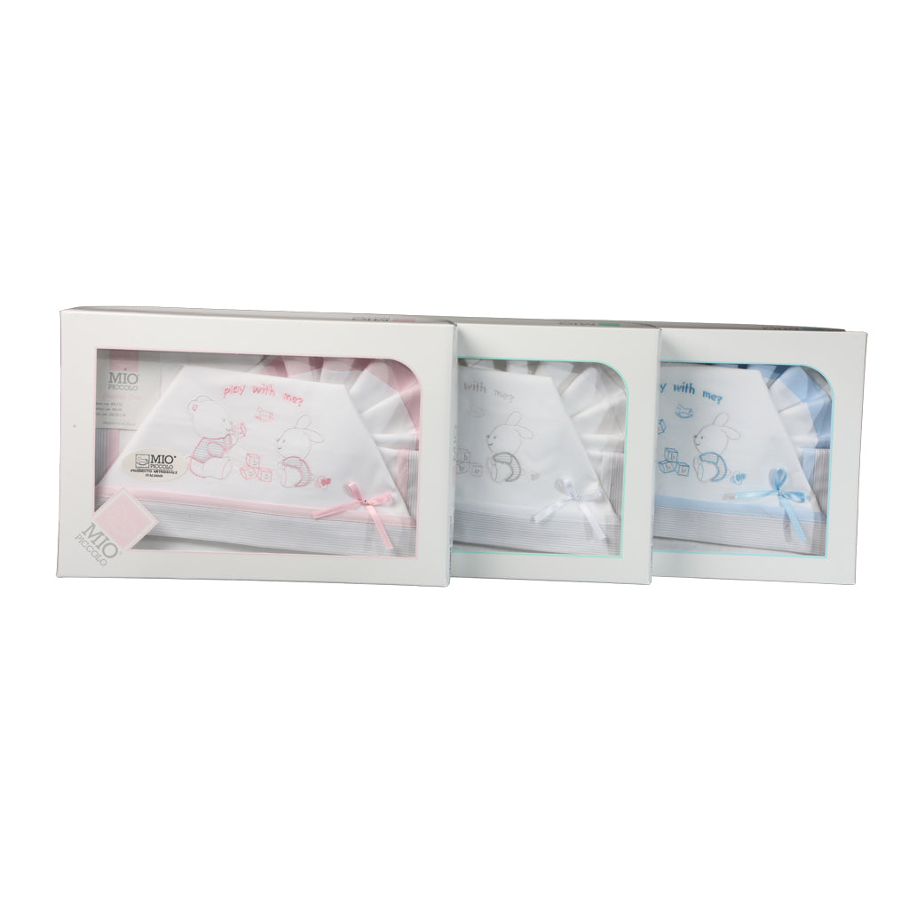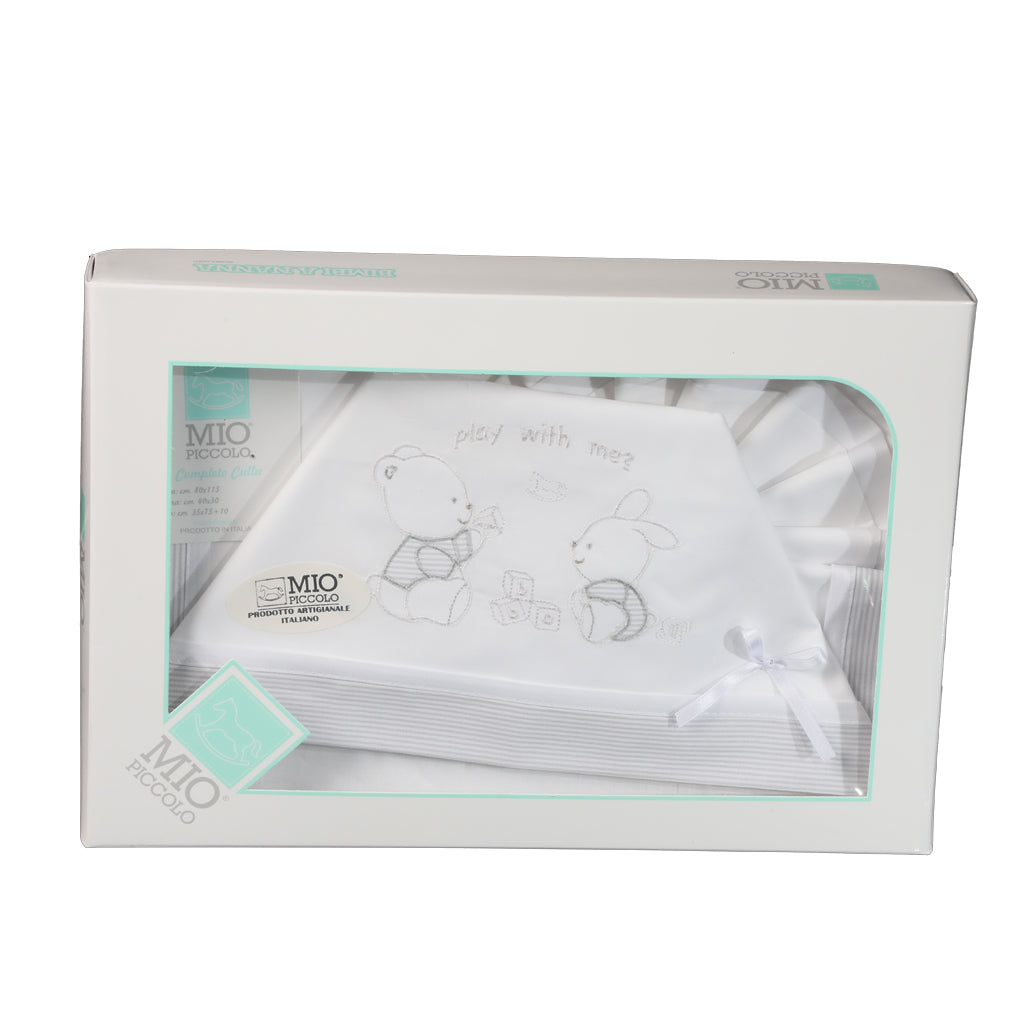 Set lenzuola per culla carrozzino in purissimo cotone, modello Play With Me, realizzato in modo artigianale interamente in Italia dal noto marchio italiano Mio Piccolo. Il set lenzuola Play With Me è composto da un lenzuolo di sopra caratterizzato da un tenere e dolce ricamo raffigurante orsetti, un lenzuolo di sotto con angoli ed una federa, prodotto perfetto per valorizzare e rendere unica la biancheria del tuo bebè, oppure, grazie alla graziosa scatola, rappresenta anche una simpatica e gradita idea regalo.