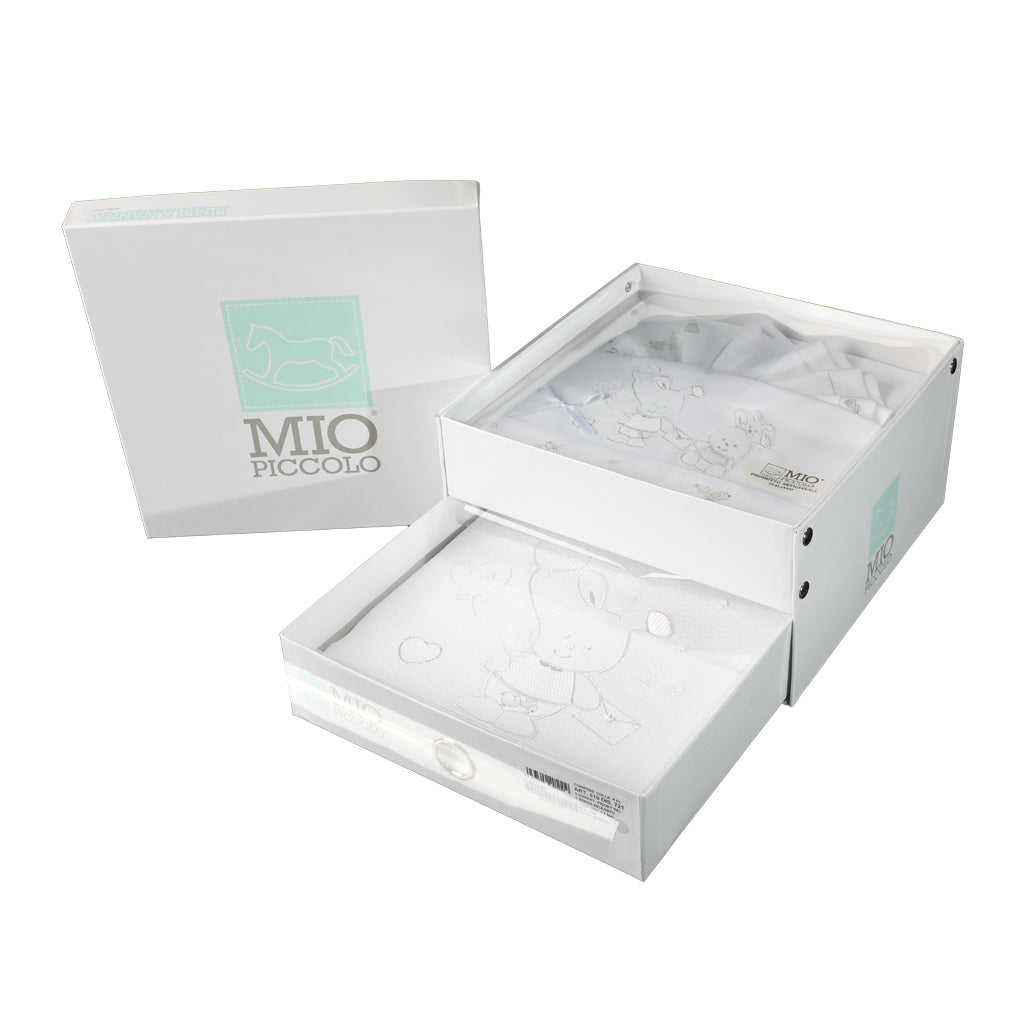 Set composto da 4 pezzi lenzuola + copertina per neonato, modello Mum & Dad, variante colore Grigio, realizzato interamente in Italia dal brand per neonati Mio Piccolo, usando un morbido e puro cotone 100%. Il set lenzuola + copertina è caratterizzato dal tenero ricamo di orsetti sul lenzuolo di sopra ed al centro della copertina in piquet, perfetto per chi ama avvalersi di biancheria di qualità per il proprio bebè, inoltre grazie al magnifico scatolo a bauletto, rappresenta anche una gradita e simpatica idea regalo.