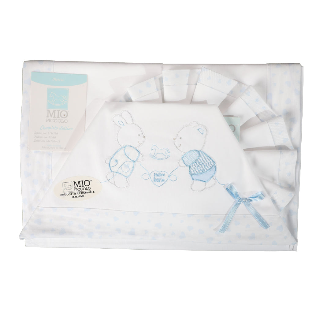 Completo Lenzuolo adatto sia per la culla che per il carrozzino del tuo bambino "Be Happy" realizzato in puro cotone 100% e con bordatura con cuoricini con l'azzurro.