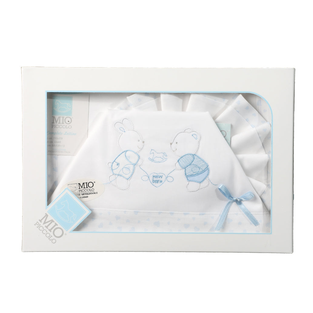 Il lenzuolo di sopra ha inserti di orsacchiotto e coniglietto ricamati con l'azzurro e cucito un fiocco di nastro di raso per conferire al lenzuolo un tocco di eleganza.