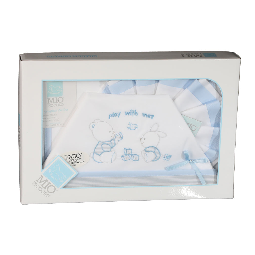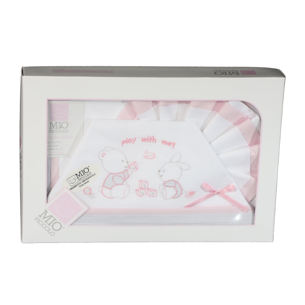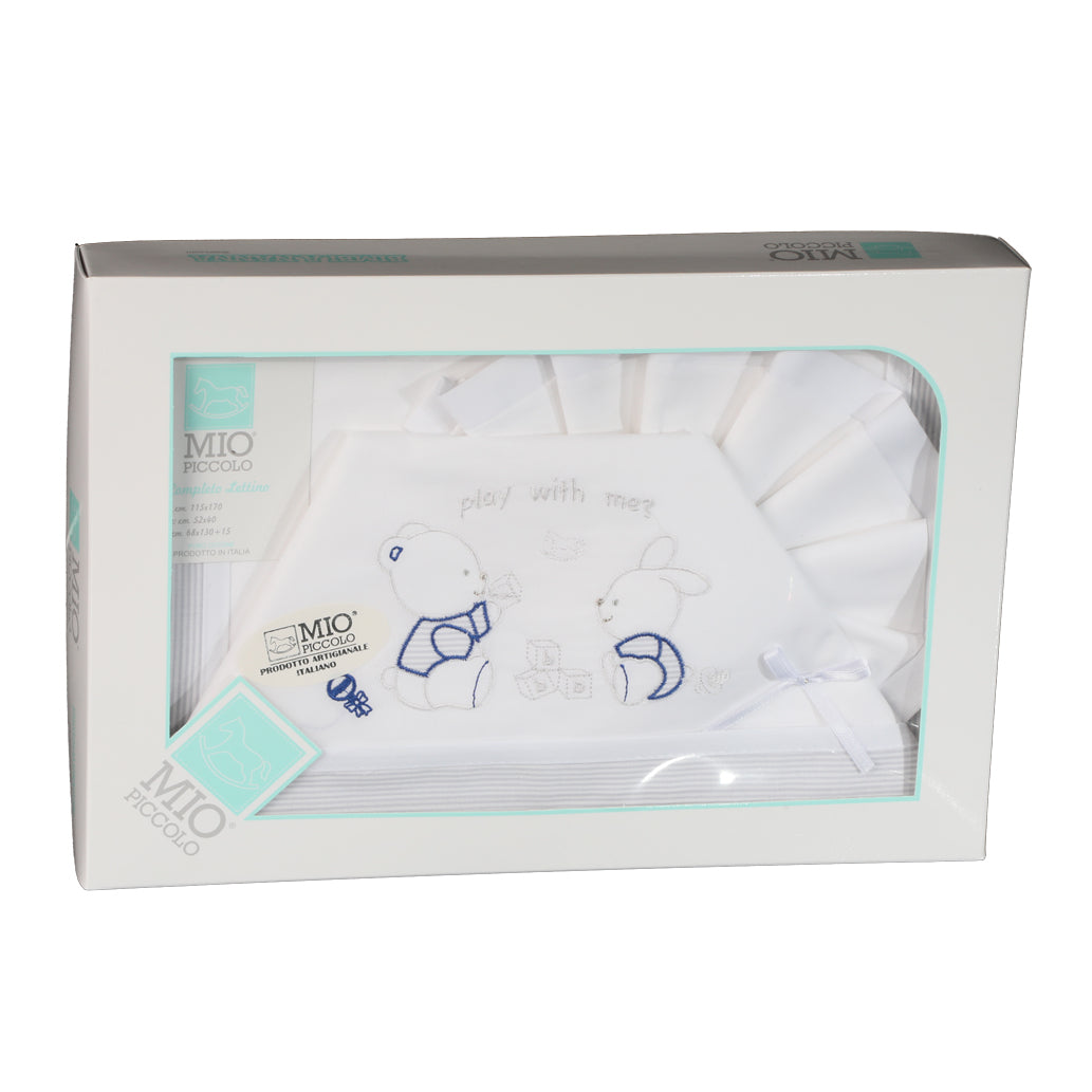 Set di lenzuolo per culla lettino Play With Me, disponibile in vari colori, realizzato interamente in Italia usando un morbido puro cotone dal brand ricercato Mio Piccolo. Il set lenzuolo per culla lettino Play With Me è perfetto per ogni tipo di arredamento, ideale per valorizzare i dettagli della biancheria del tuo bebè oppure, grazie all' elegante scatola rigida, rappresenta una simpatica e gradita idea regalo.