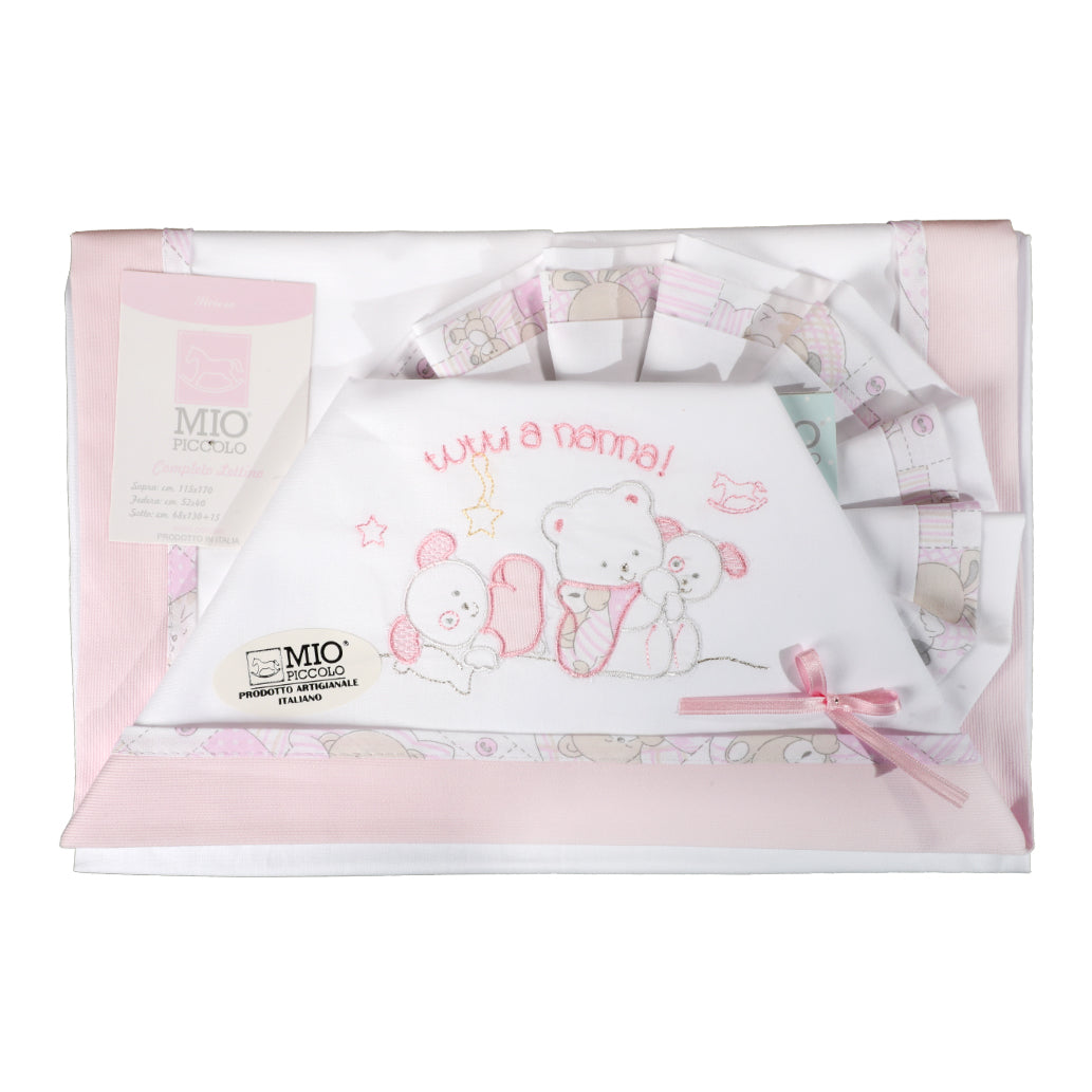 Adatto da 0 mesi in poi. Sul Lenzuolo di sopra sono ricamati degli orsacchiotti pronti per andare a nanna. Il bordo del lenzuolo è tutto rosa e interni a fantasia.