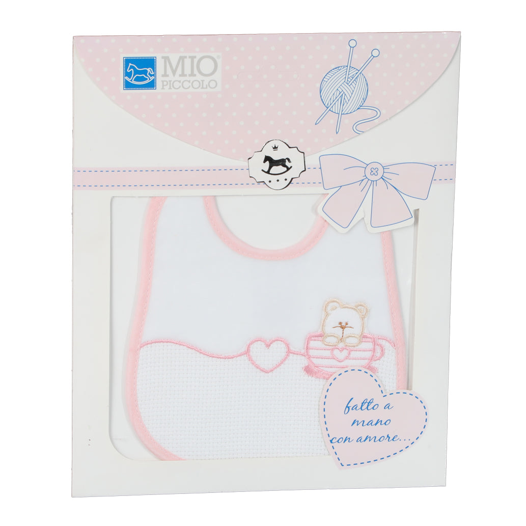Bavaglino con laccetti per neonati da Ricamare con inserto in tela aida, modello Tenero Orso, disponibile in vari colori, lavorazione artigianale, realizzato in Italia dall' esclusivo brand Mio Piccolo. Il bavaglino Tenero Orso è caratterizzato dal ricamo di un orsetto in una tazza con al centro un dolcissimo cuore, il tutto personalizzabile grazie all' inserto, nella parte inferiore, della tela aida, mentre la parte superiore è in ciniglia. Il bavaglino si presenta confezionato in una graziosa e simpatica busta regalo.