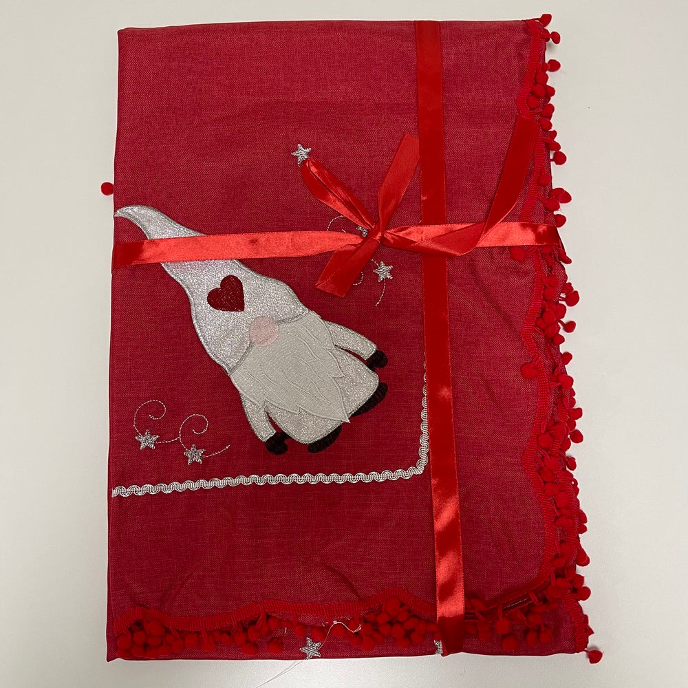 La tovaglia è caratterizzata dall'applicazione dell' iconoco Elfo natalizio, un elegantissima cornice argentata e bordi con Pon Pon.