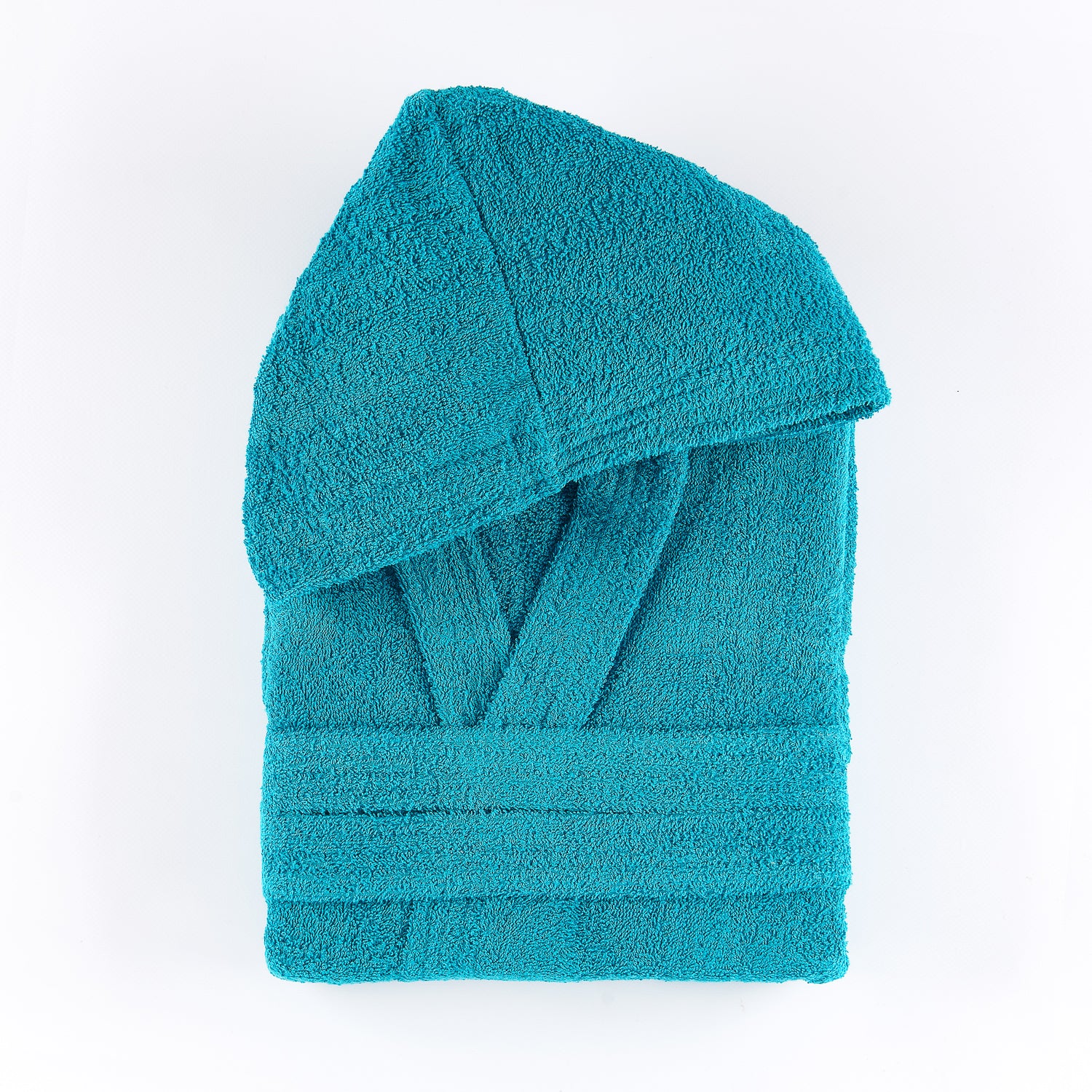 Bademantel mit Kapuze und Gürtel, erhältlich in verschiedenen Größen und Farben.