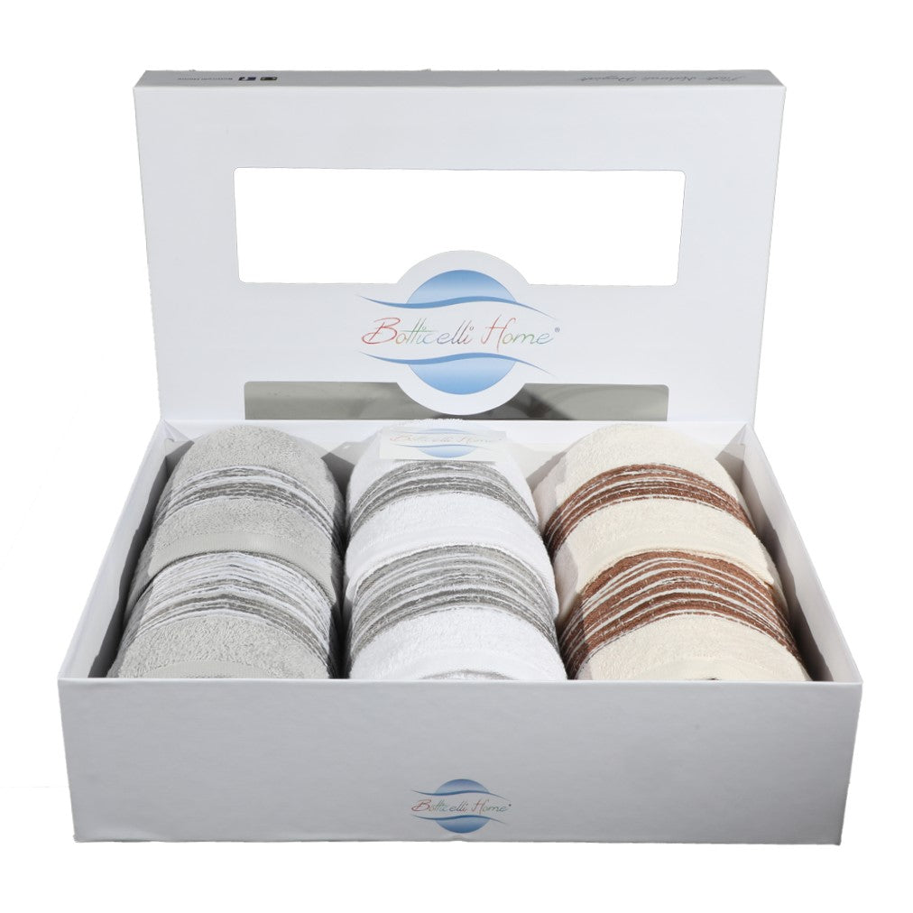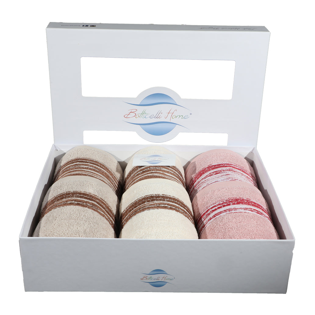 Set aus weichen Frotteehandtüchern für das Badezimmer, bestehend aus 3 Gesichtshandtüchern und 3 Gästehandtüchern, mit hoher Saugfähigkeit, verschleiß- und waschbeständig, Modell Stromboli, hergestellt von der bekannten Marke Botticelli Home. Das Stromboli-Handtuchset zeichnet sich durch die besondere gestreifte, bestickte Bordüre aus, ein perfektes Modell, um die Details der Einrichtung Ihres Badezimmerbereichs hervorzuheben.