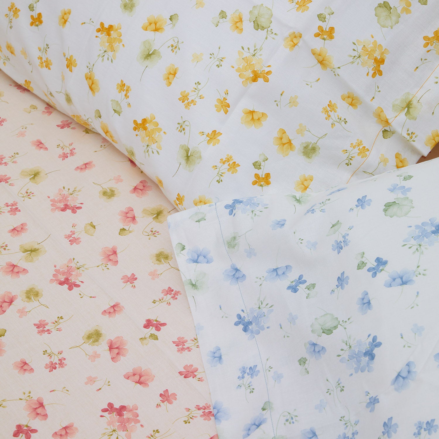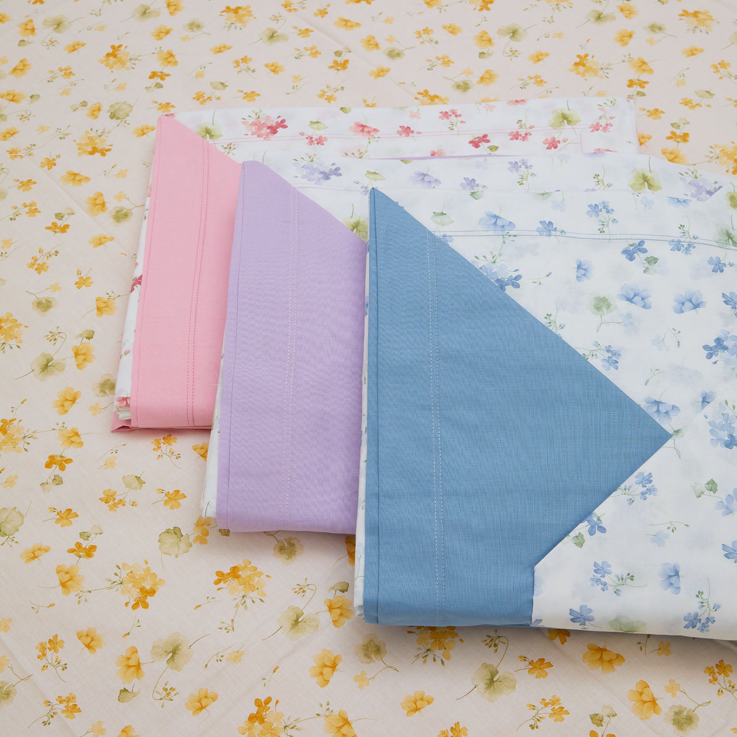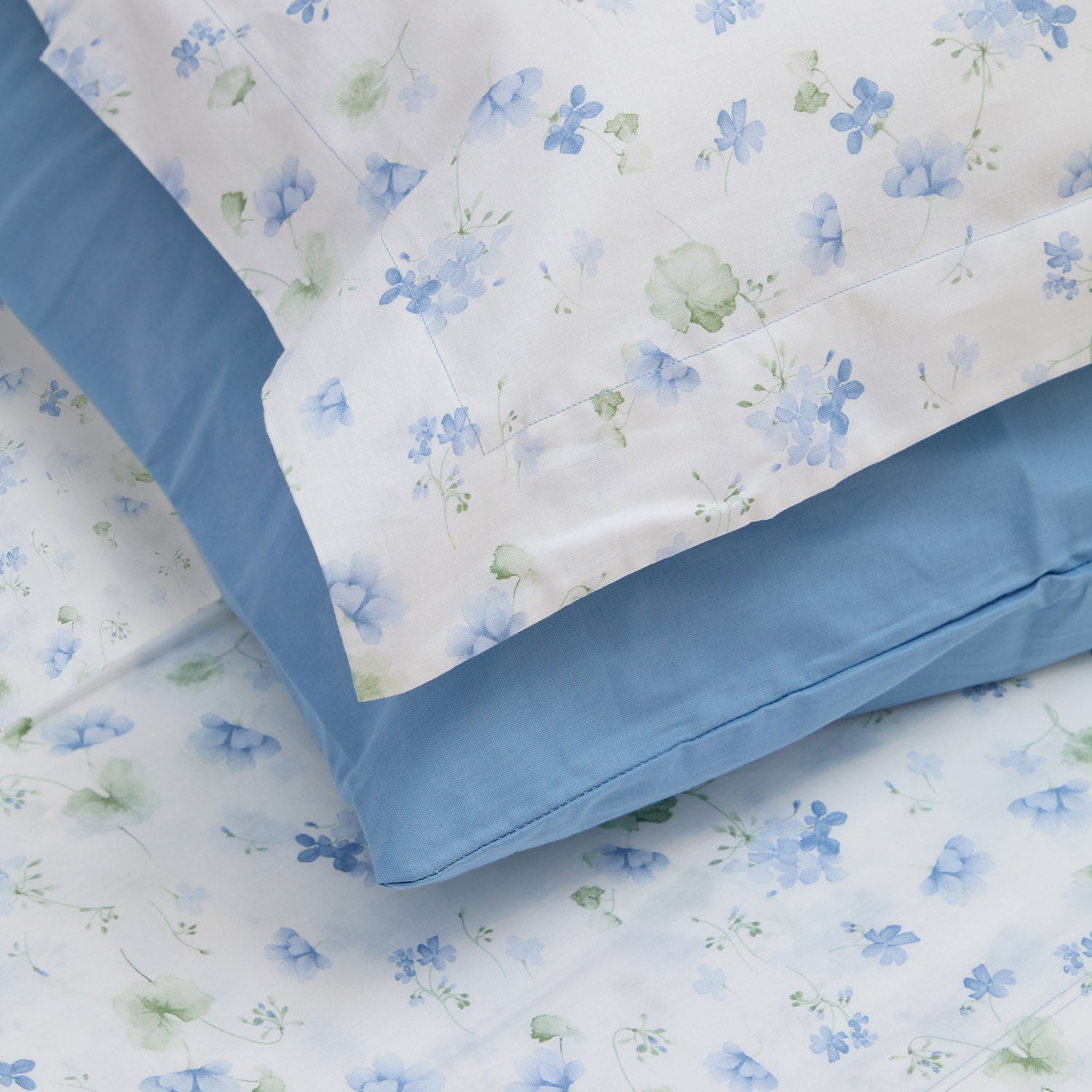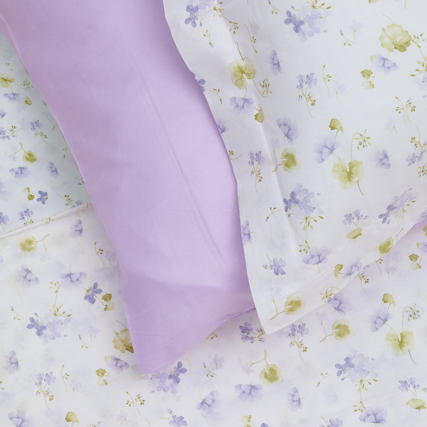 Das Set enthält 4 Kissenbezüge, davon 2 mit 3-Voilant-Muster und 2 weitere einfarbig, kombiniert mit dem Unterlaken.