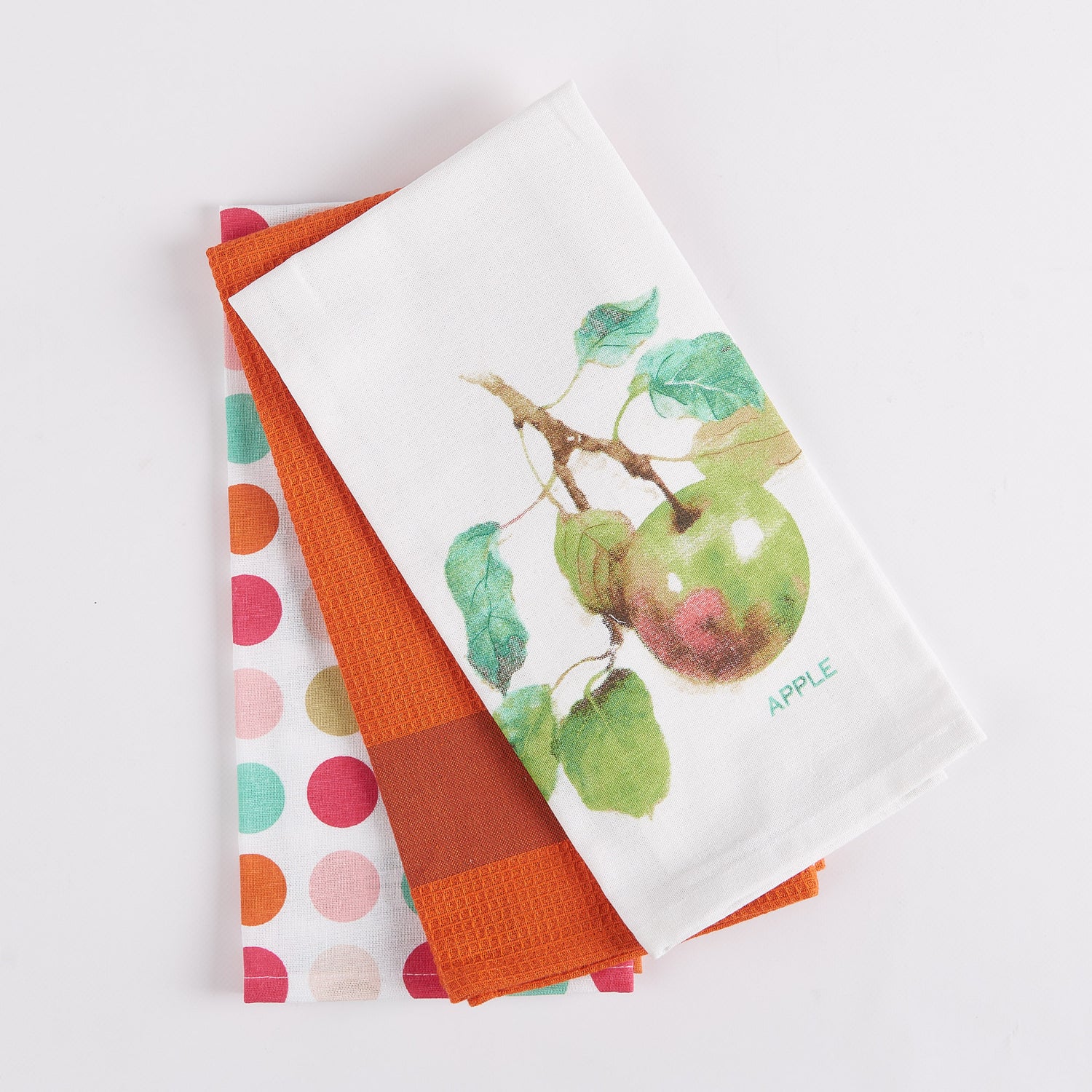 Il set è costituito da 3 strofinacci coordinati tra loro, di cui 1 in nido d'ape a tinta unita e 2 stampati.