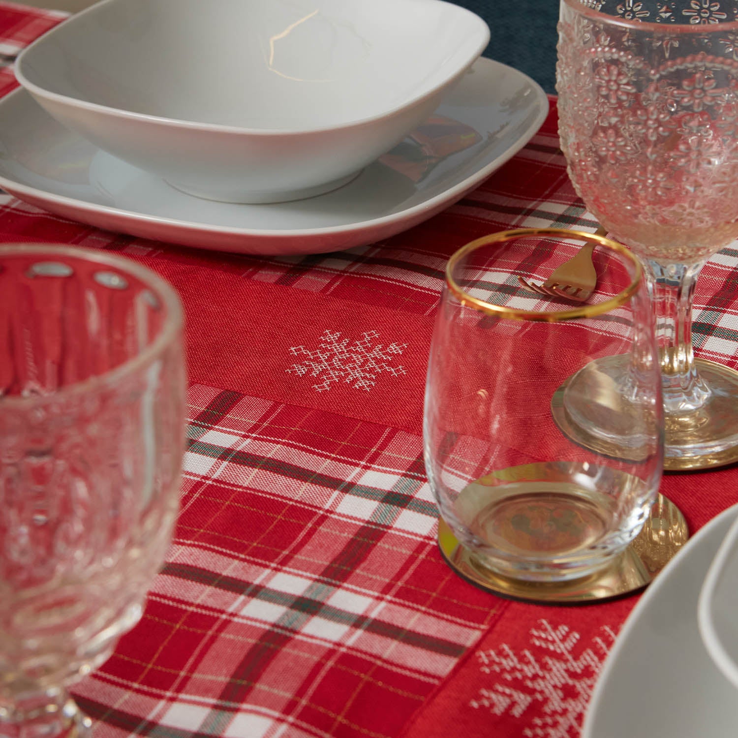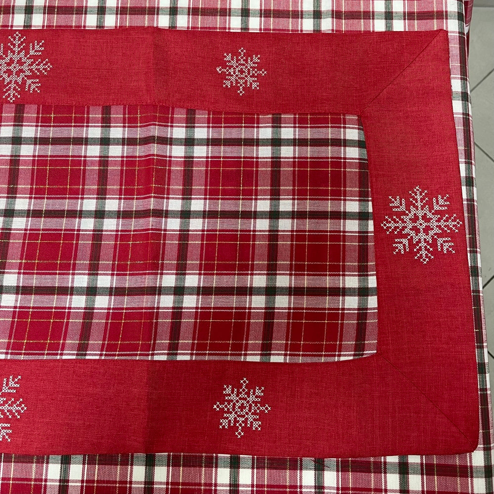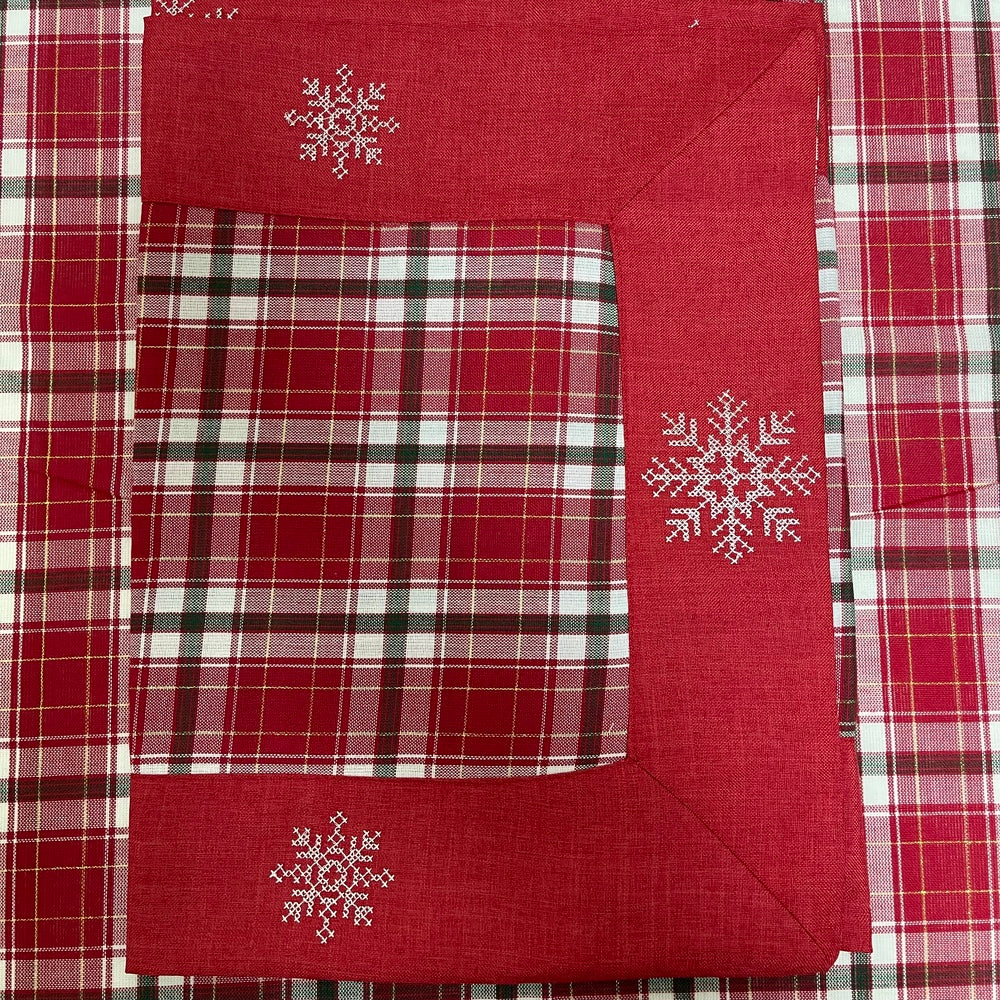 Der Sleet-Läufer ist mit dem begehrten Tartan-Muster versehen, mit einem einfarbigen Rand und einer Applikation aus silbernen Schneeflocken.