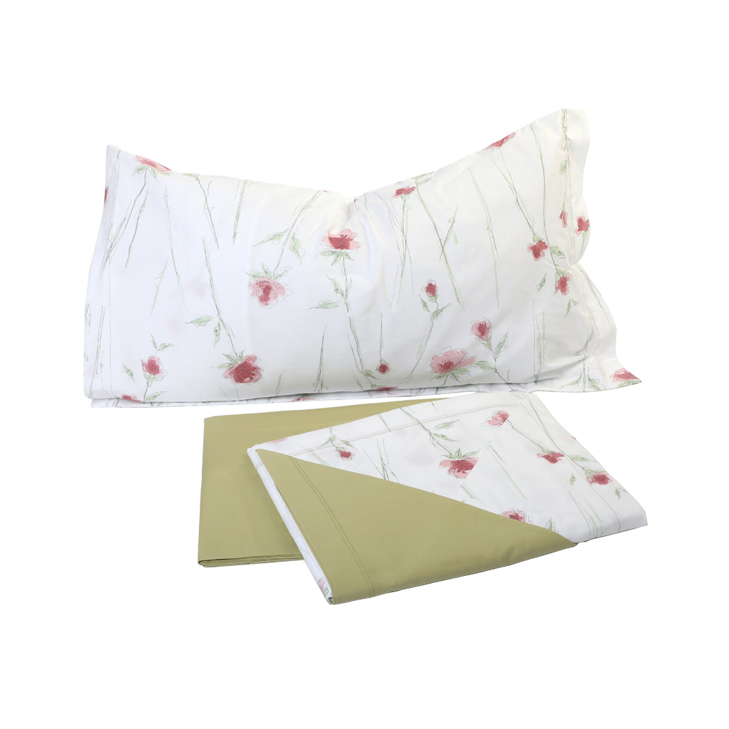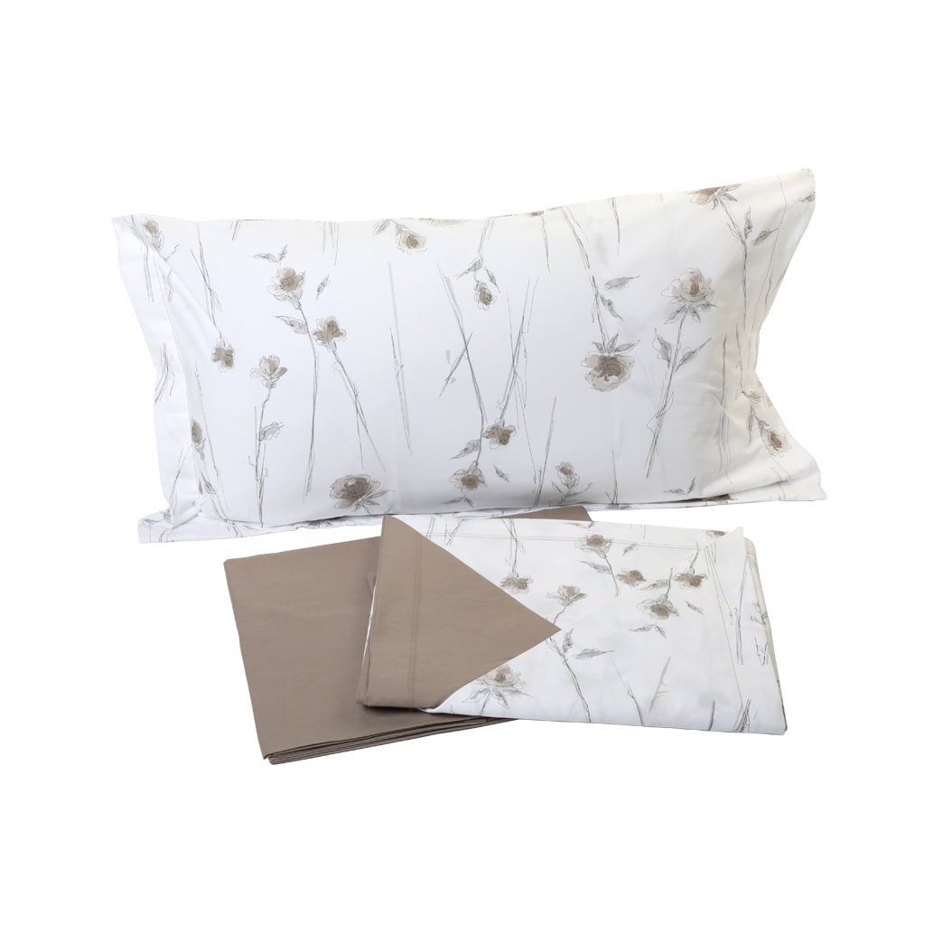 The patterned sheet set for the double bed in pure cotton with a flower design by the Italian brand Botticelli Home contains a top sheet, a bottom sheet with corners and 4 pillowcases with 3 flywheels. Produced and made entirely in Italy.
