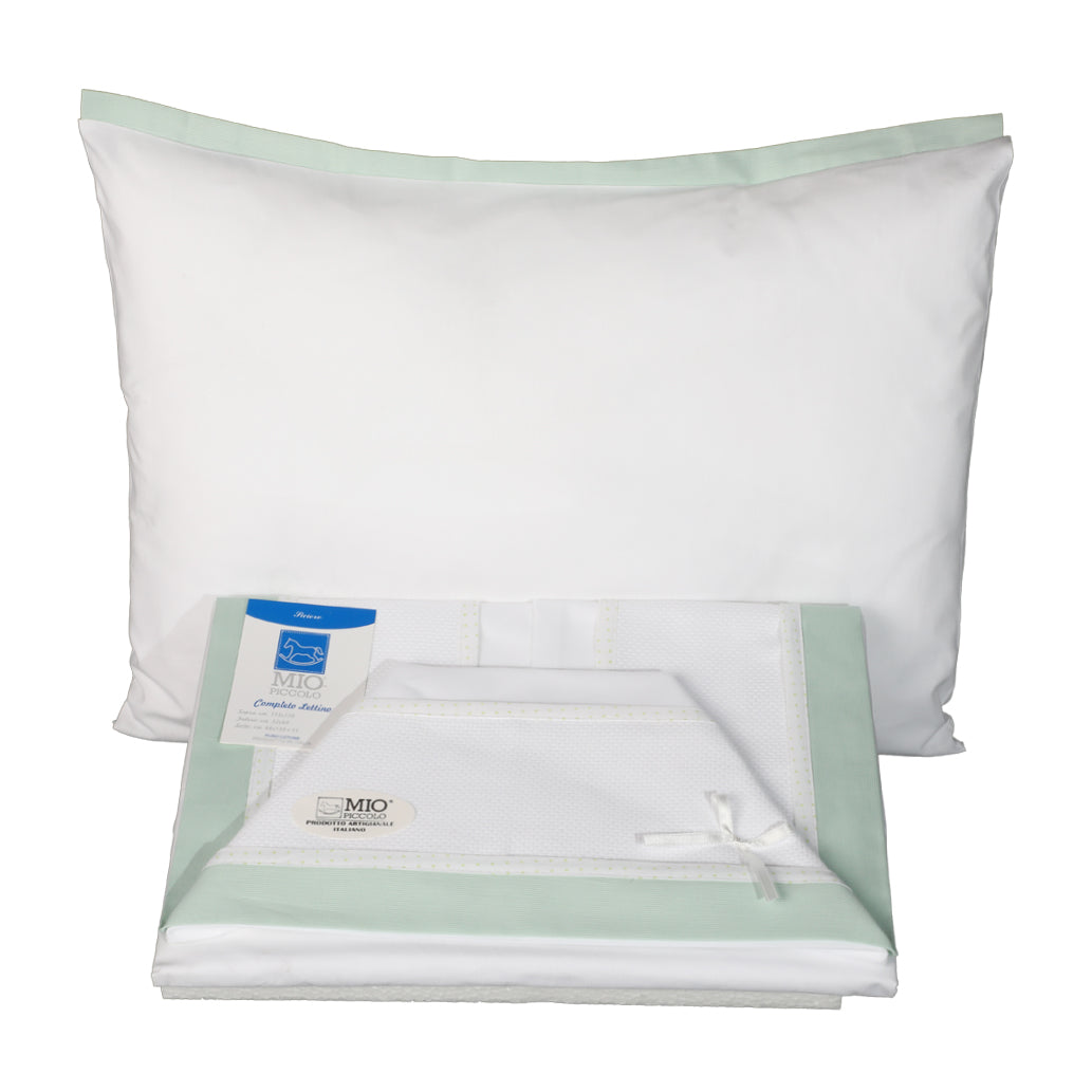 Cot sheet set for pram to be embroidered on aida fabric enriched by the application of the Piquet border, Piquet model of the Italian brand Mio Piccolo, made entirely in Italy in an artisanal way. The sheet set includes a top sheet, a fitted bottom sheet and a pillowcase. The Piquet sheet set represents the ideal product for those who love to decorate and make their baby's linen unique or also perfect as a gift idea, thanks to the elegant rigid box packaging.