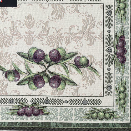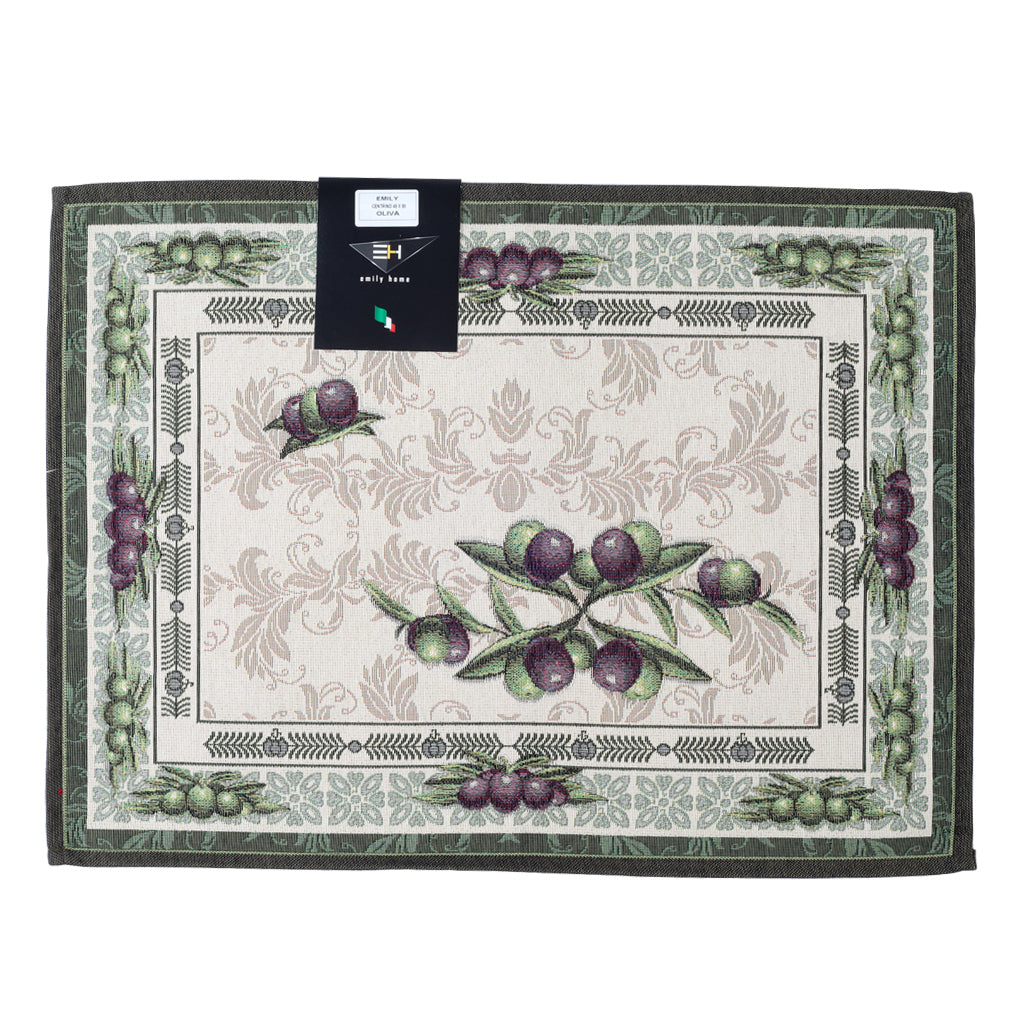 Magnificent placed centerpiece from the exclusive Italian brand Emily Home, Olive design, perfect for any type of furniture, made entirely in Italy in handcrafted Gobelin furnishing fabric in dyed yarn on a jacquard loom which gives the design a raised effect as if it were three-dimensional. The centerpiece also represents a welcome, ideal gift that can be coordinated with a table cover, furnishing cushion, chair cushions and runner.