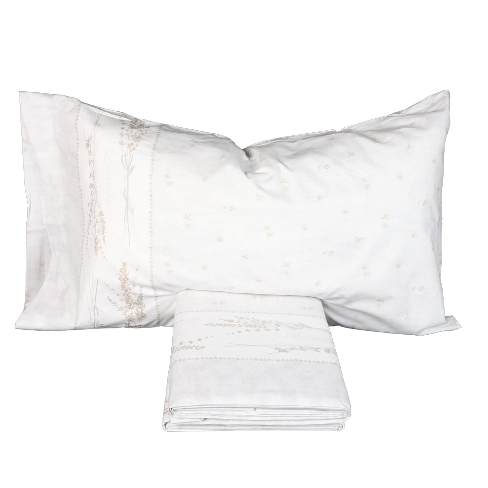 Double bed sheet set, Lavender model, in Pure Cotton Percale, Made in Italy. Consisting of top sheet 245x290 cm, bottom sheet 180x200 cm with corners, and 4 pillowcases 50x80 cm. With a suggestive lavender floral design in a particular shade of Taupe. Created by the well-known brand Maé by Via Roma, 60.