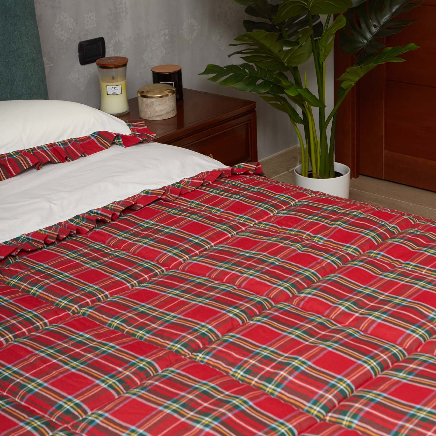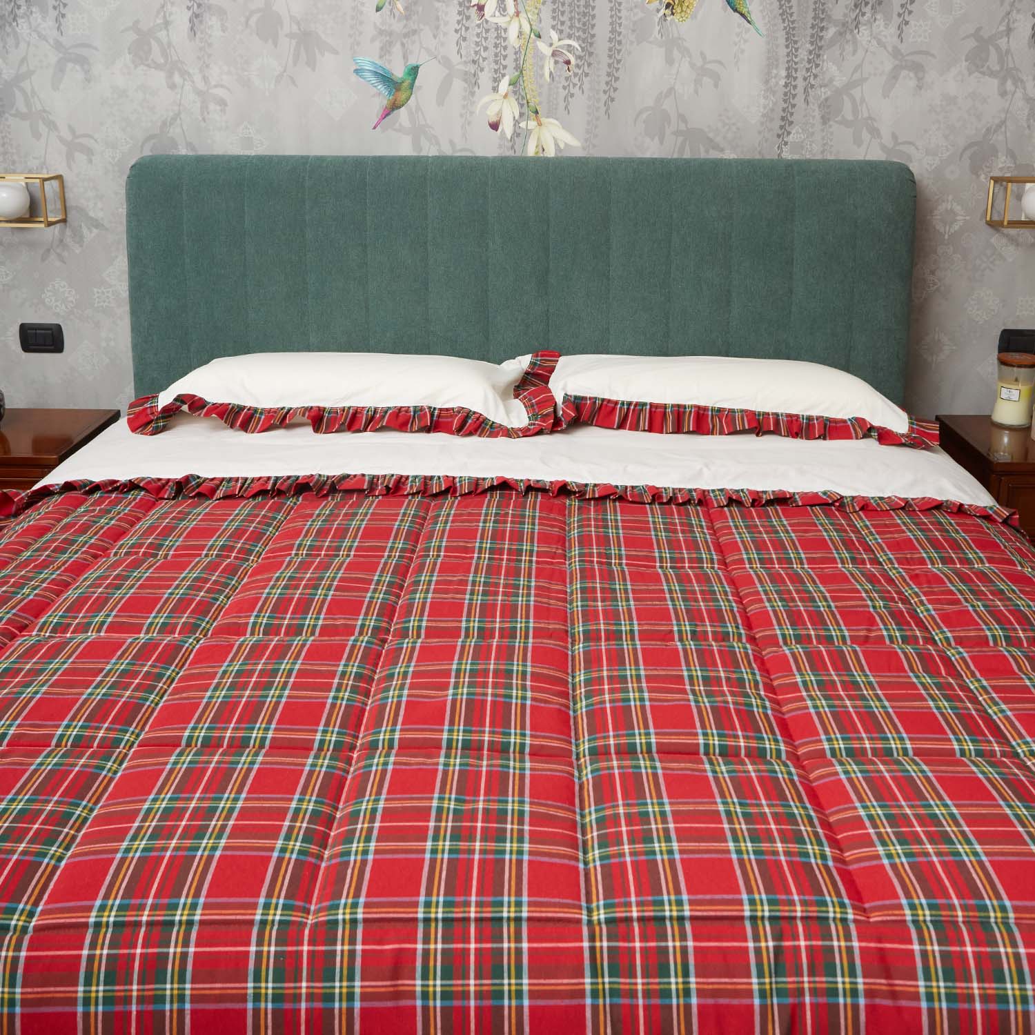 Rouche in fantasia Tartan applicata ai voilant delle federe e del lenzuolo di sopra.